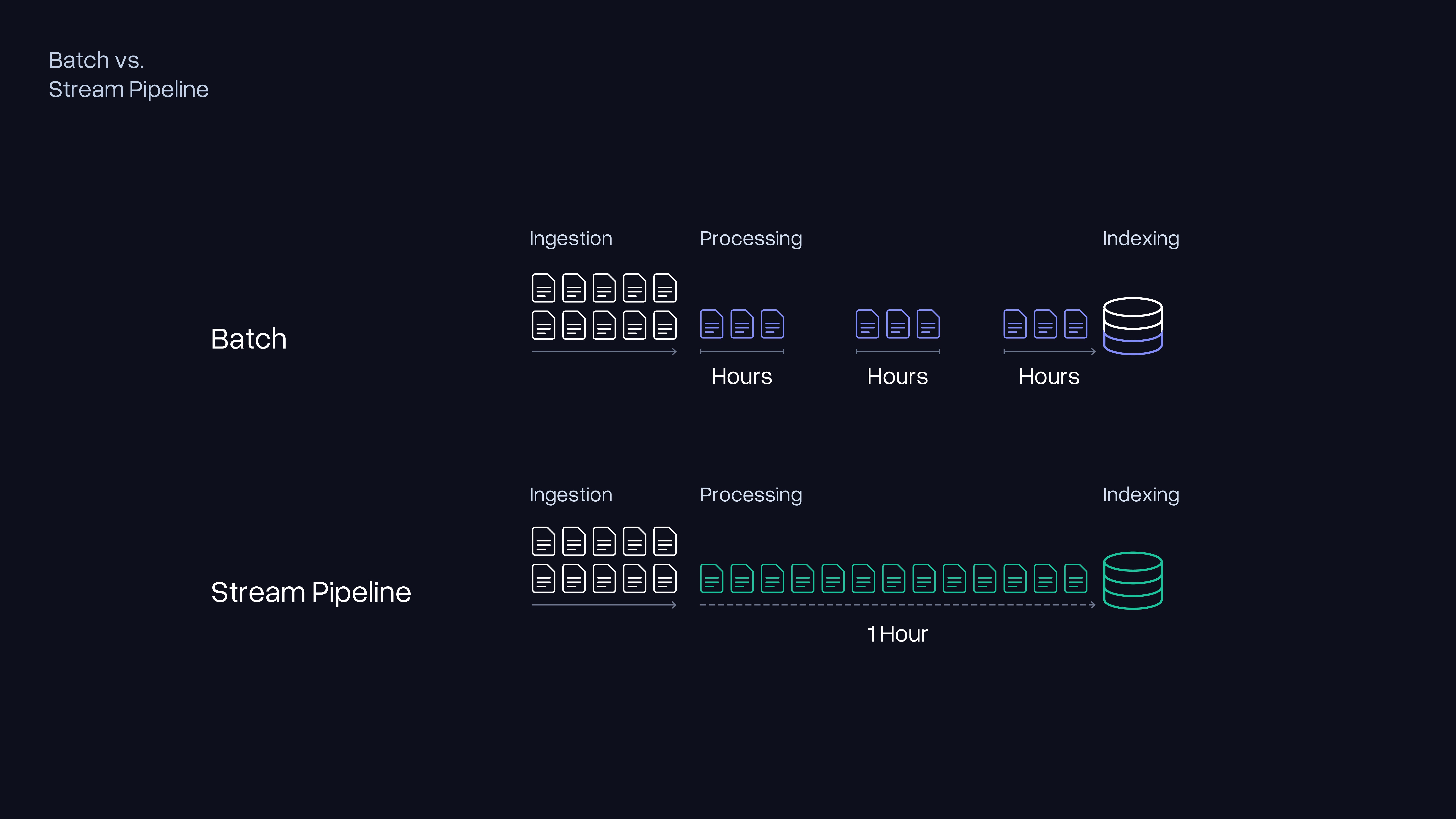 Stream-oriented architecture solves this by eliminating the batch cycle entirely. Rather than accumulating documents and processing them together on a schedule, every document that enters the system flows continuously through each pipeline stage. Ingestion feeds directly into processing. Processing feeds directly into indexing. No accumulation point exists where documents wait for the next cycle to begin.