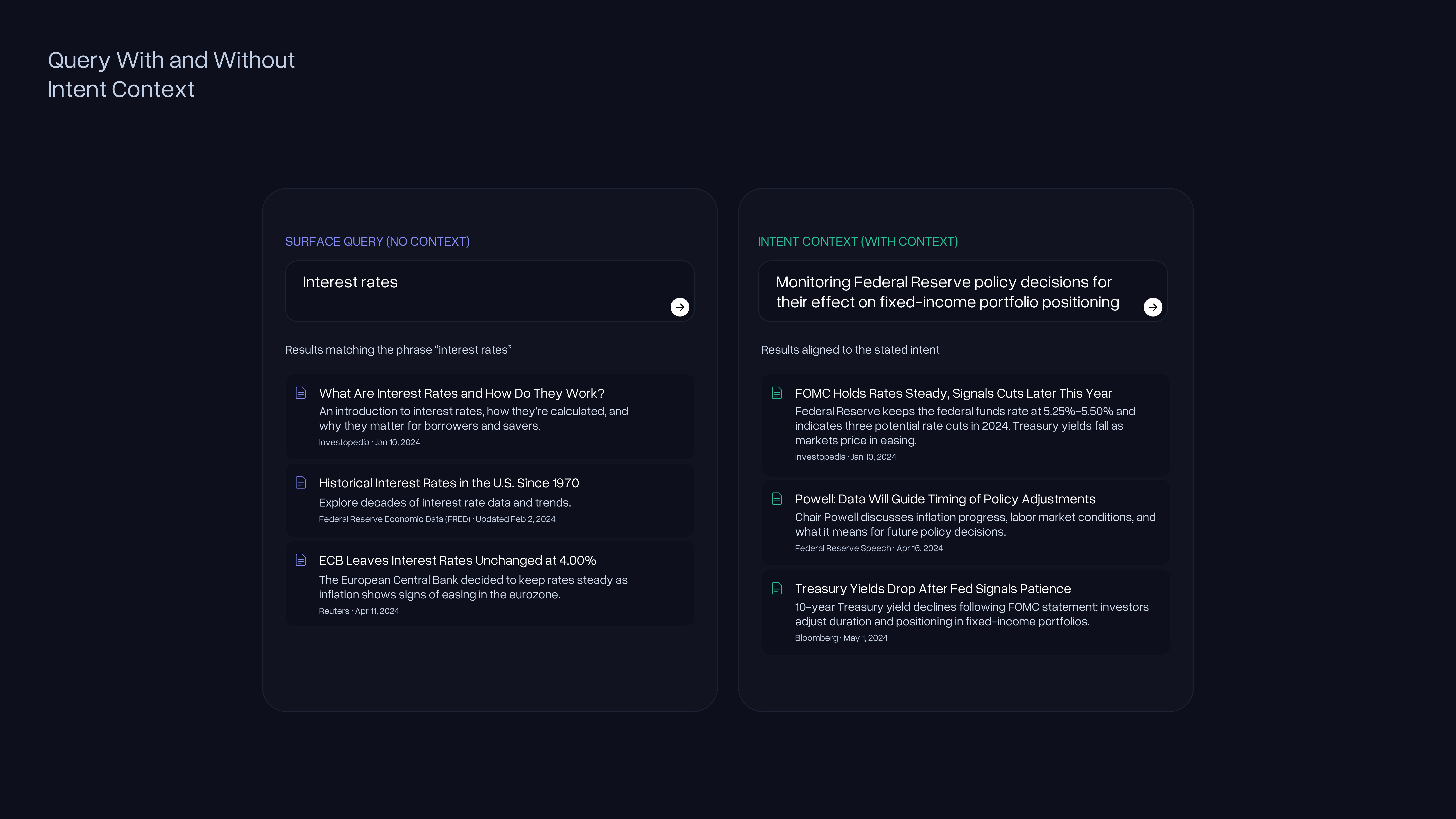 Your trading algorithm can communicate that it is monitoring news about a specific company for market-moving developments. Your compliance tool can specify the regulatory domain it is tracking. The result set reflects that intent, not just the surface keywords in the query string. Agents can provide paragraphs of intent context, and the API is built to use it.